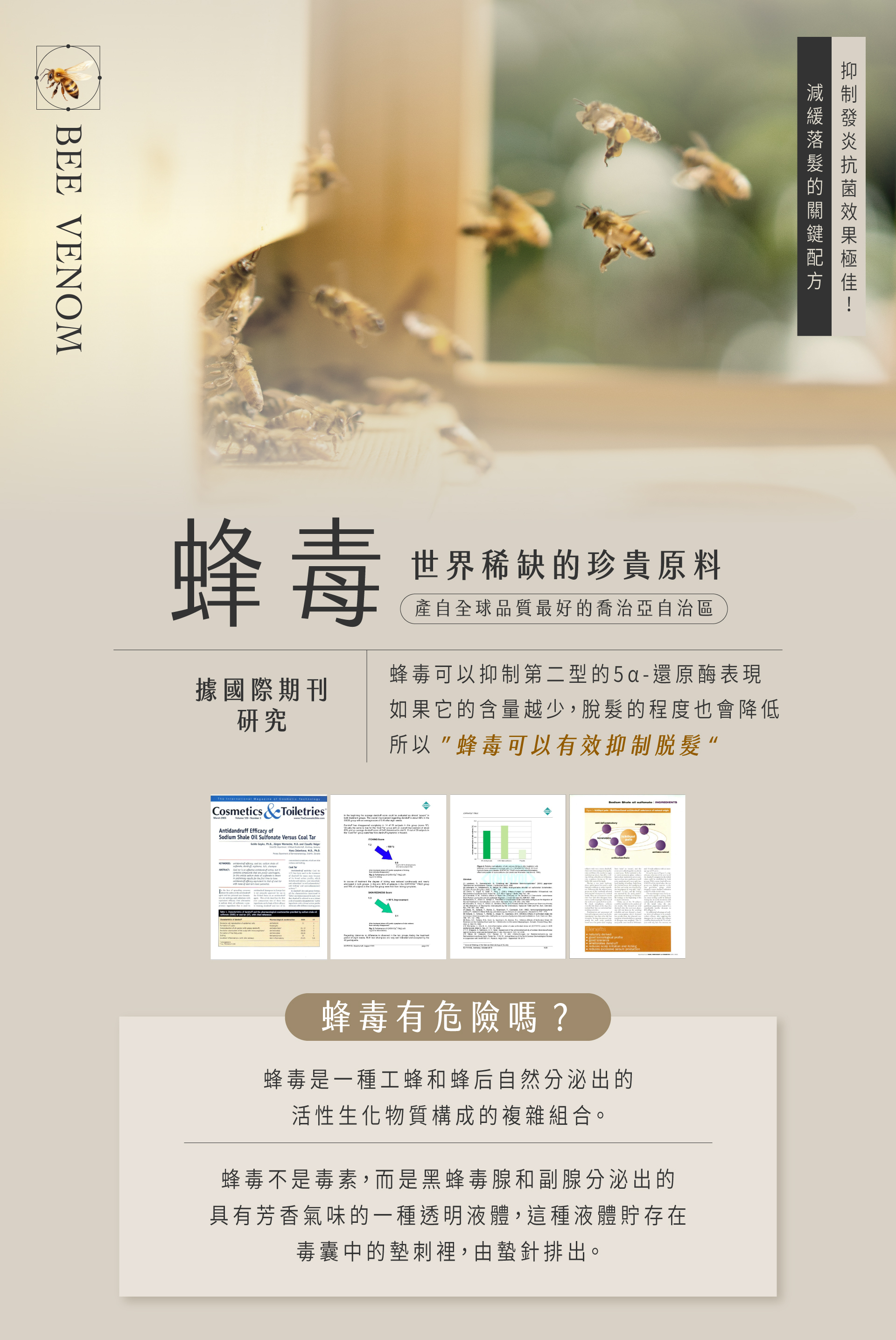 • 透過科學驗證,蜂毒中的天然胜肽能有效抑制5α-還原酶活性