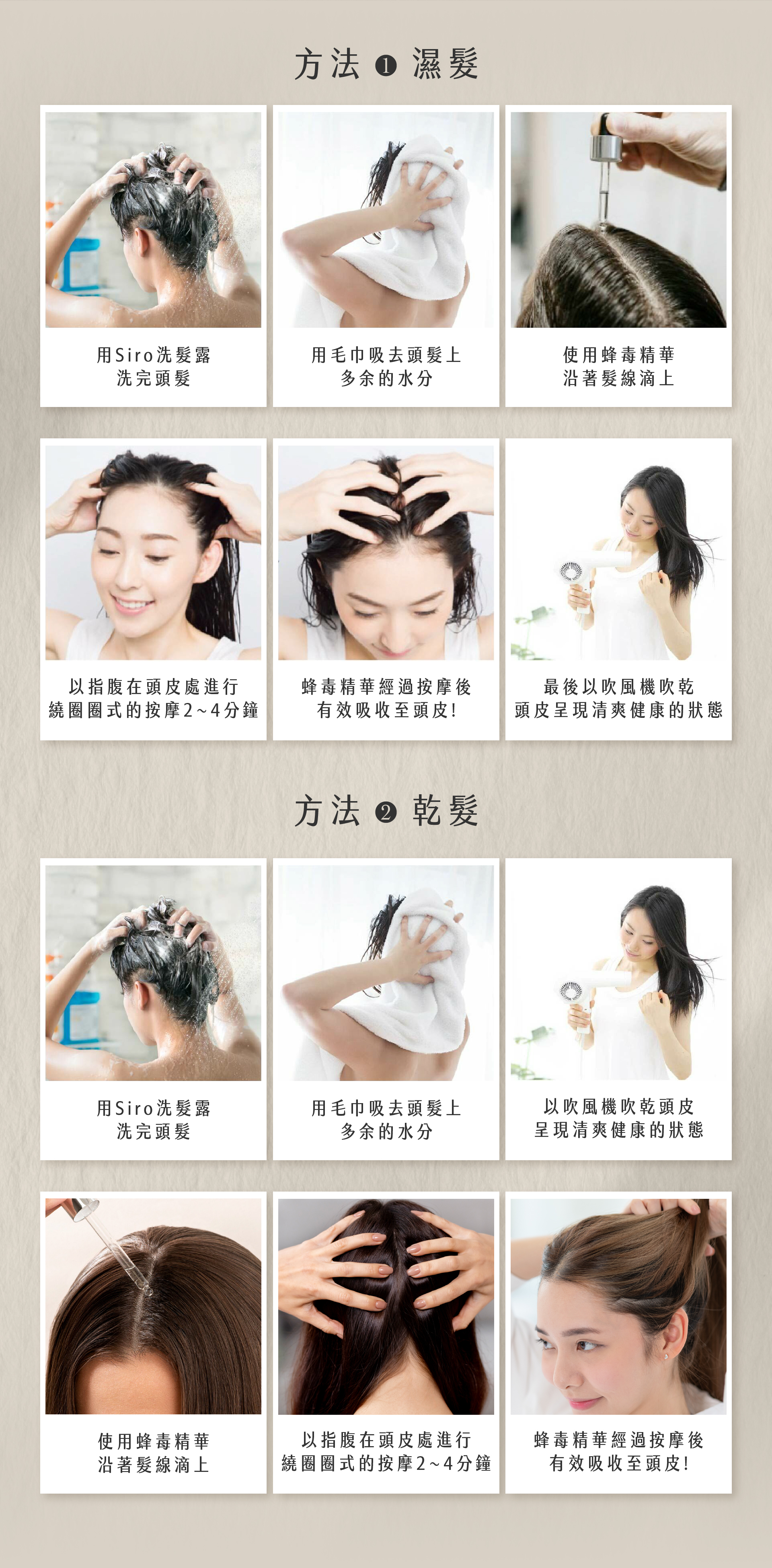 • 用手指按摩頭皮幫助吸收