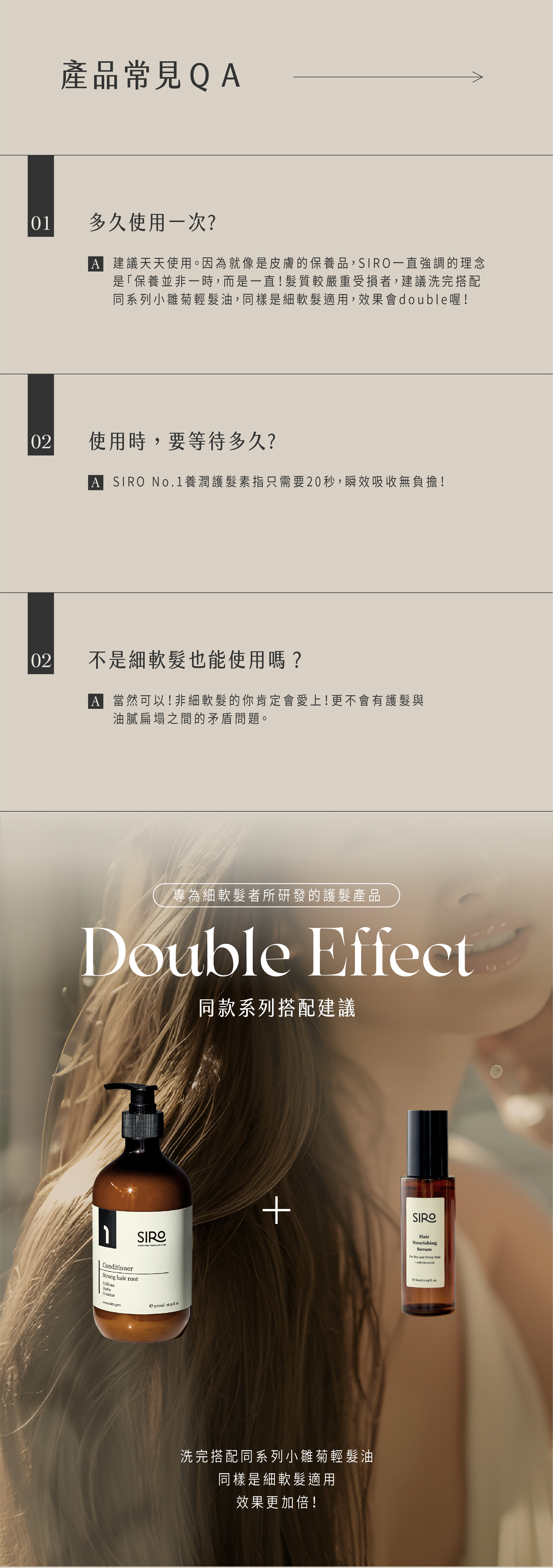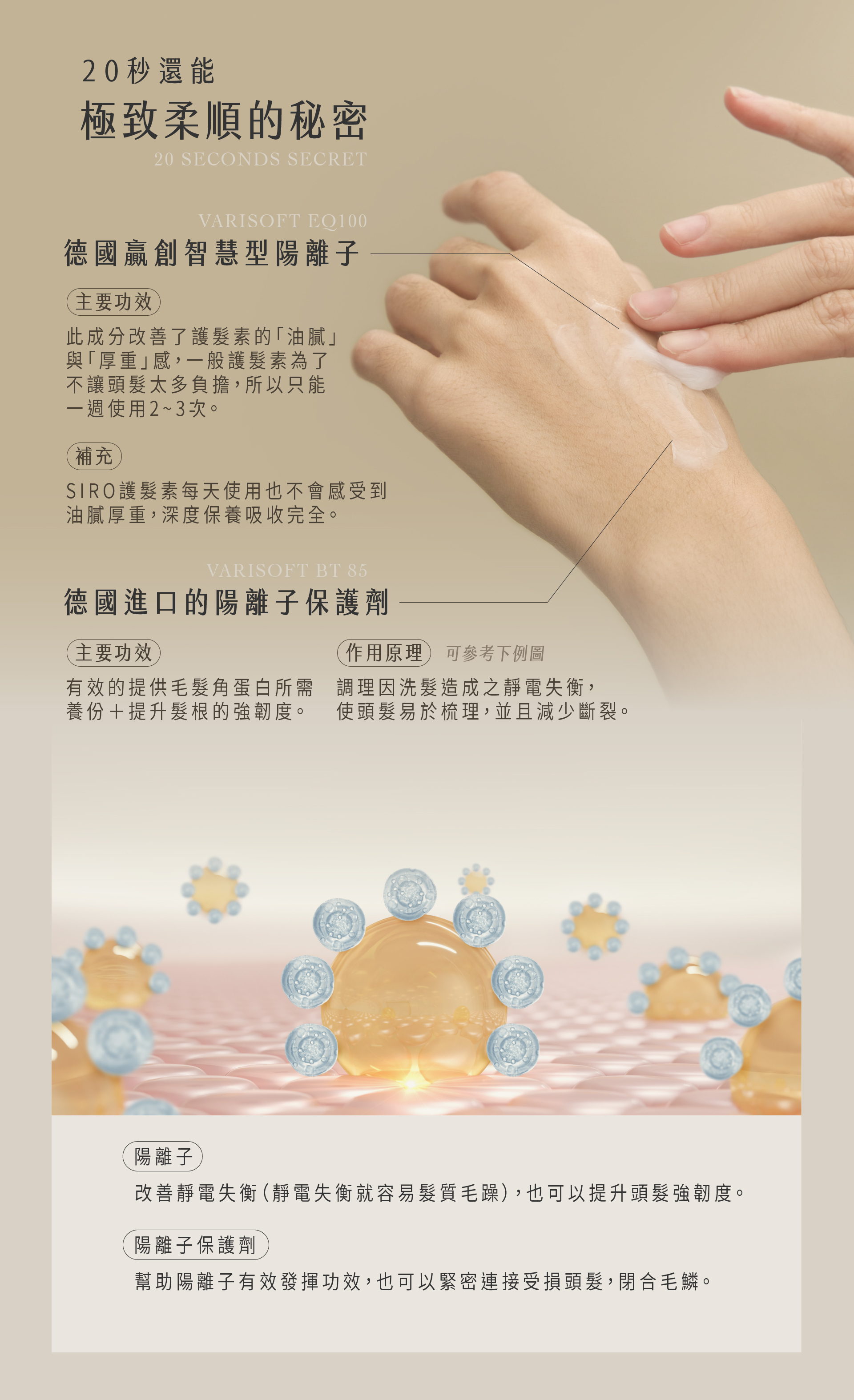使用德國贏創智慧型陽離子Varisoft EQ100,提供毛髮角蛋白所需養份,有效提升髮根的強韌度,調理因洗髮造成之靜電失衡,使頭髮易於梳理
